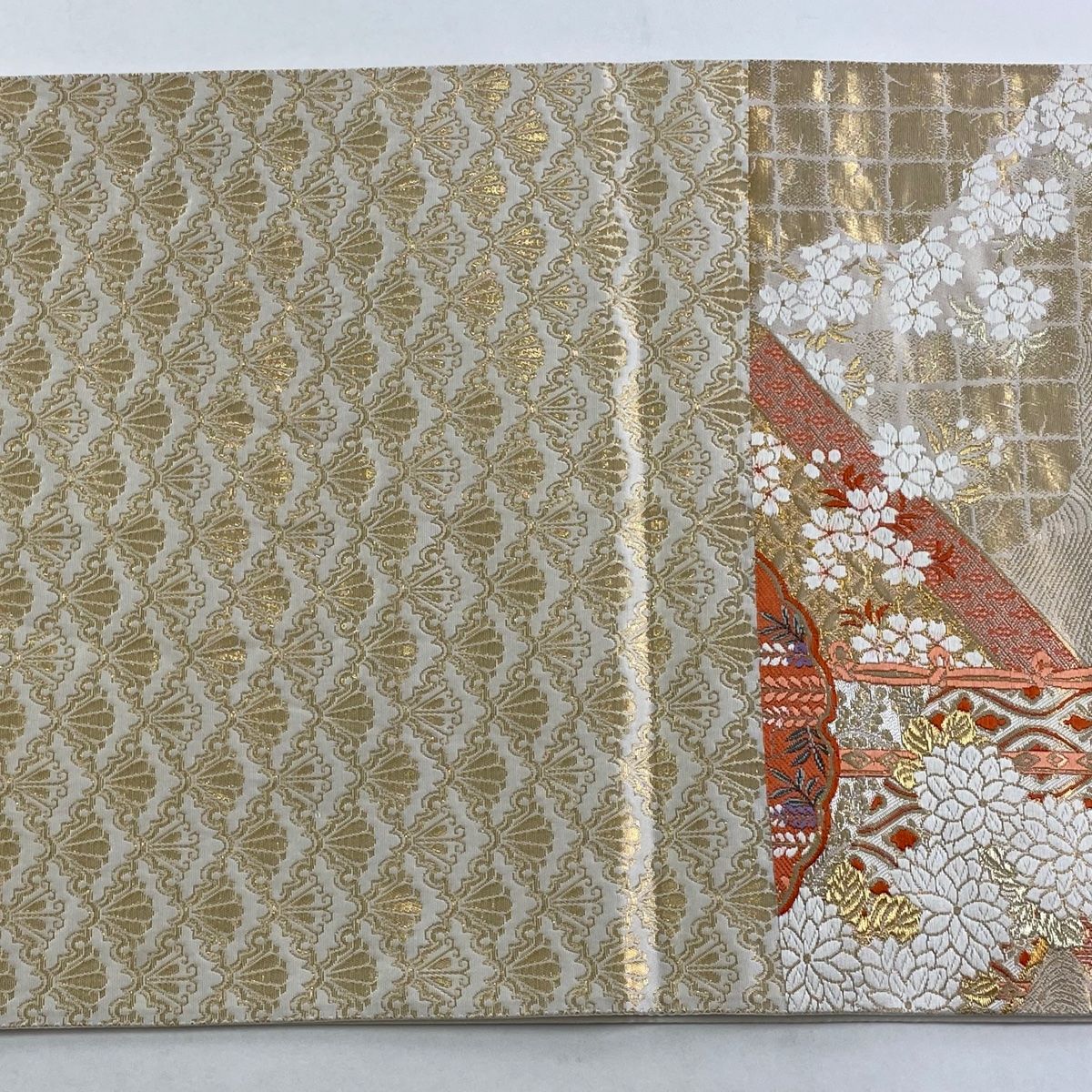 袋帯 秀品 関西仕立て 扇 牡丹 金銀糸 箔 クリーム 六通 正絹 GLOBALQUALITYIMPORTS_COM