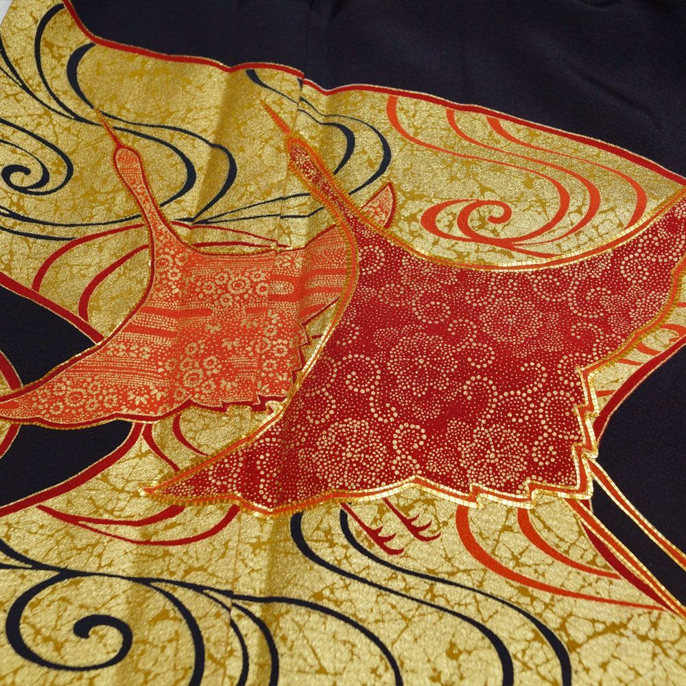 和洋折衷 黒留袖 着物 リメイク ワンピース ドレス 洗える 化繊 ハンドメイド レトロ 古着 黒場に絵巻の風景が咲く TKW-77