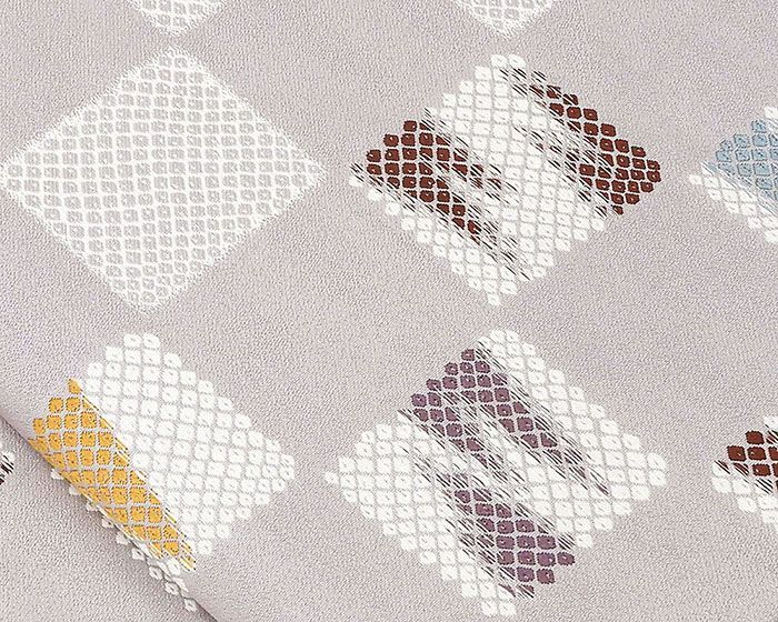 渋め牡丹鼠色地に山吹色や赤錆色・紫などの多色で格子幾何模様が柄付けされています。