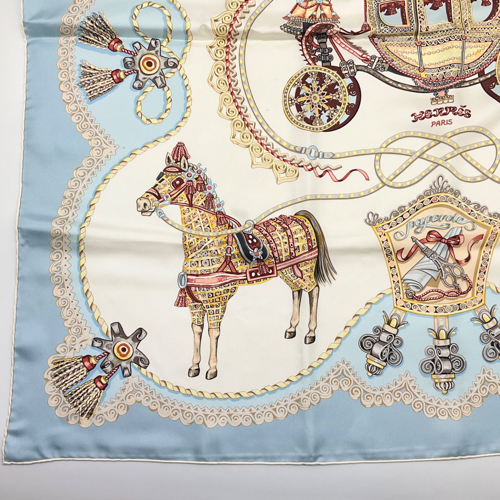 HERMES エルメス カレ90 スカーフ PAPEROLES パプロール 馬車と貴族 シルク ブルー系 ホワイト マルチ ABランク 6_193の検索結果