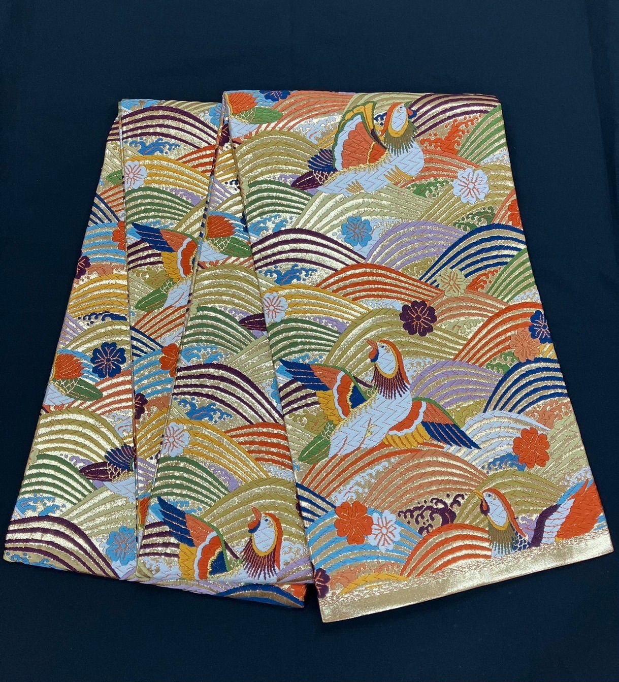 柄はカラフルな…青丹色、紺色、端色、緋色、山吹色、黄土色などで波が華やかに刺繍されていて中に鳥と花が飛んでいます。
