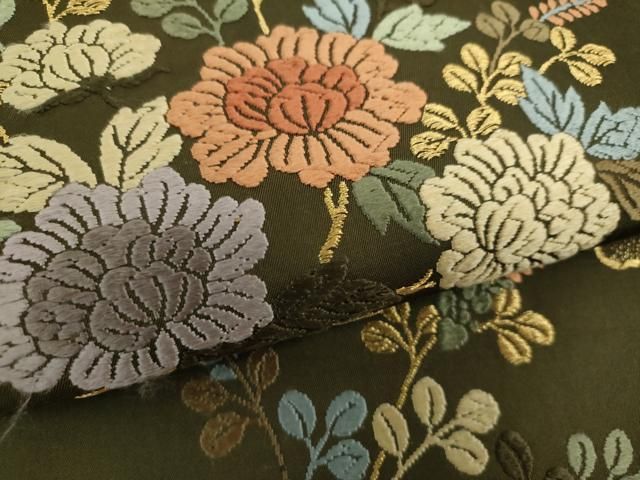 特選 袋帯 正絹 カジュアル 仕立て上がり 六通 洛風林 植物文様 花模様 黒色 茶系色 草色 きもの北條 A1280-9