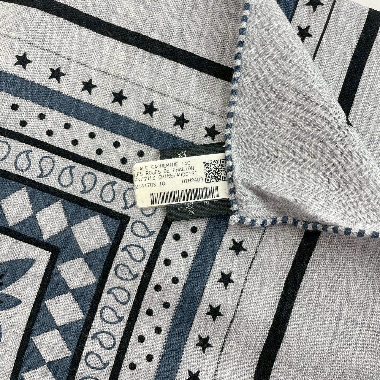 Hermès エルメス Châle 140 Les Roues de Phaéton カレジュアン140 四輪馬車の車輪 カシミア70 シルク30 gris chiné ardoise clair Blackの検索結果