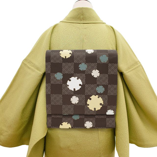 新古品 袋帯 正絹 京都 西陣 となみ織物 となみ帯 京絹 こげ茶 小菊の市松 雪輪 金箔糸 日本和装 扱い セミフォーマル カジュアル 春 秋 冬 西陣織 袋帯 仕立て上がり みやがわ sb54565の検索結果