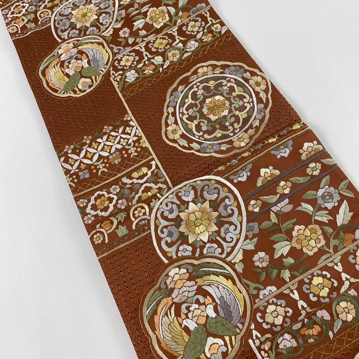 袋帯 華文 向かい鳥 刺繍 金糸 茶色 六通 正絹 GLOBALQUALITYIMPORTS_COM