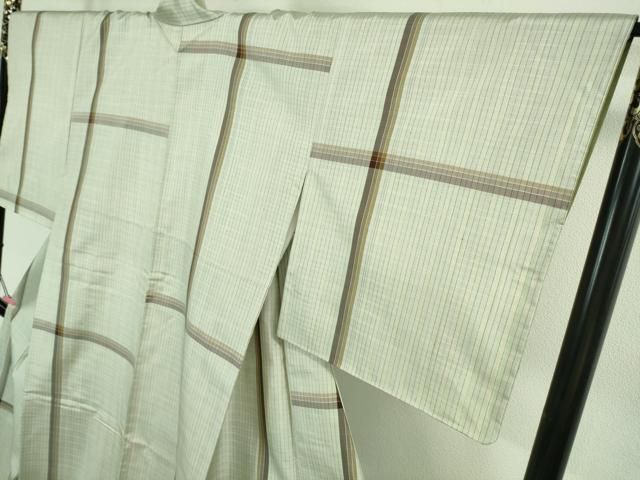 紬 身丈165.5cm 裄丈69cm L 単衣 縞 灰茶 正絹 秀品