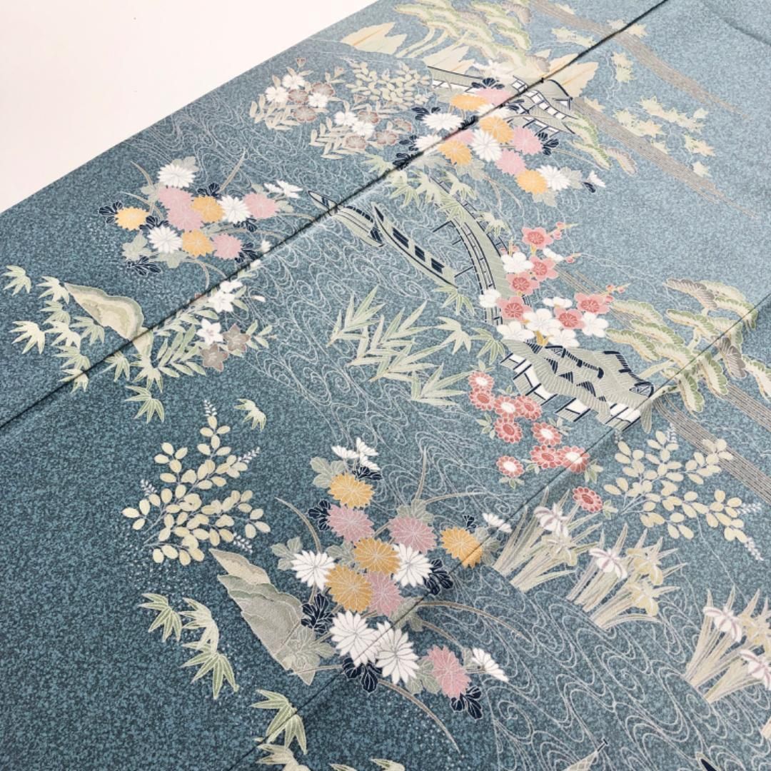 訪問着 作家物 花模様 叩き染 砧青磁色 K-5299の検索結果