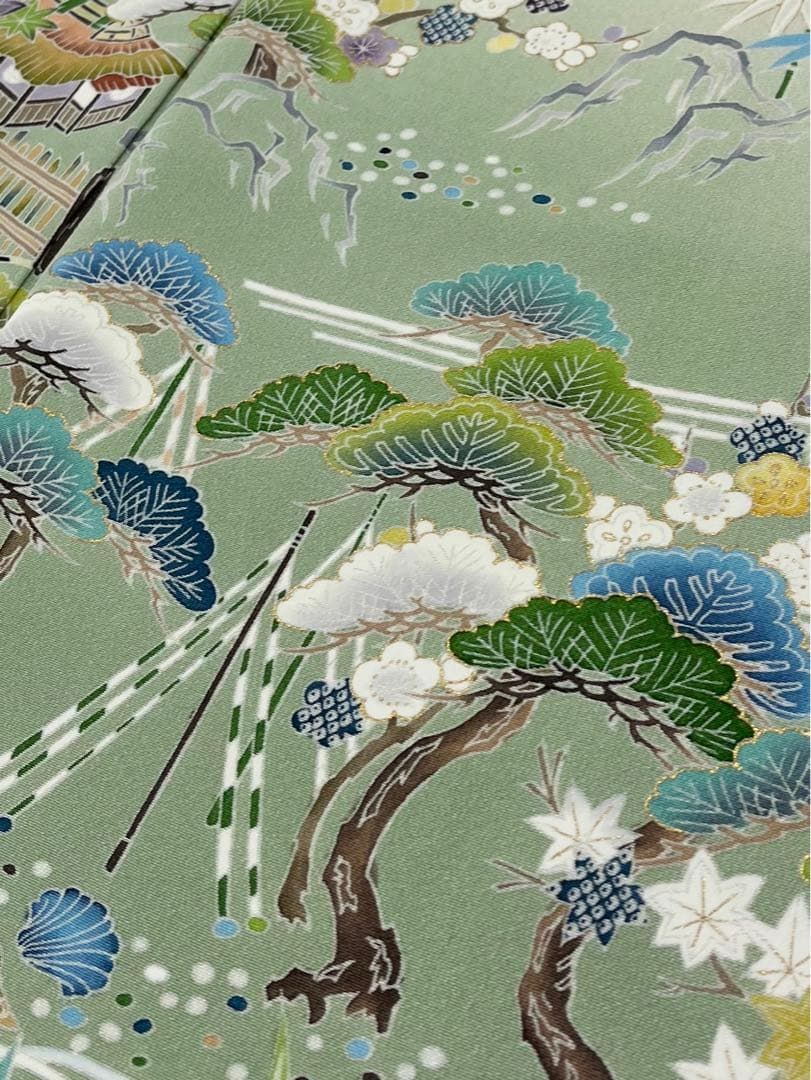 訪問着 身丈158cm 裄丈65cm M 袷 松竹梅 家屋 刺繍 金糸 灰色 正絹 秀品