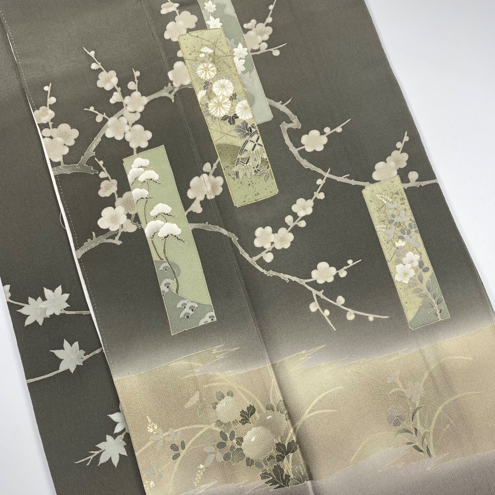 色留袖 身丈160cm 裄丈64cm M 袷 風景 松竹梅図 灰緑 正絹 秀品 一つ紋