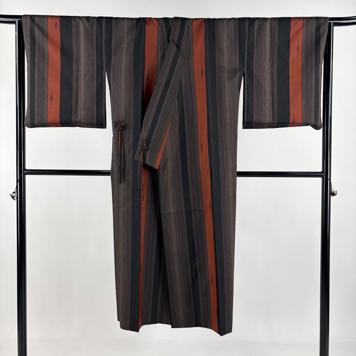 道中着 身丈131.5cm 裄丈67cm M 和装コート 着物衿 リバースブル 大島紬地 落款 証紙 縞 赤茶 正絹 GLOBALQUALITYIMPORTS_COM