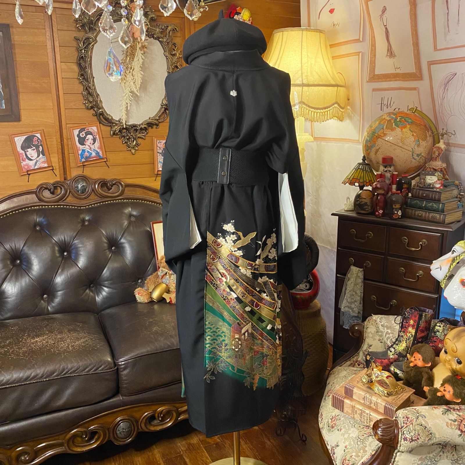 和洋折衷 黒留袖 着物 リメイク ワンピース ドレス 洗える 化繊 ハンドメイド レトロ 古着 漆黒に金の水脈 白朱の鶴が舞う TKW-78