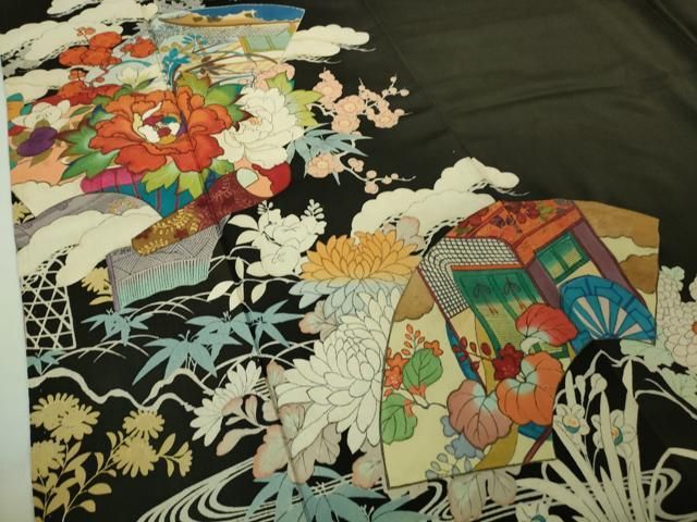 平和屋着物 豪華黒留袖 作家物 駒刺繍 短冊吉祥扇面花車文 暈し染め 金彩 正絹 CAAW8154yc