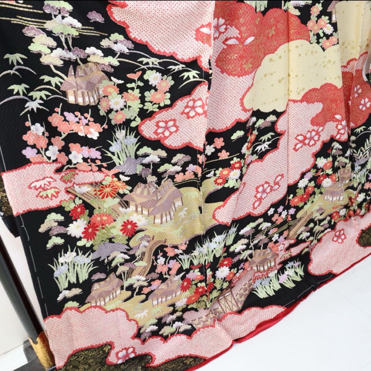 振袖 仮絵羽 未仕立て 茶屋辻模様 刺繍 八掛付き 同梱 リメイク用 ブラック 和裁 K308 GLOBALQUALITYIMPORTS_COM