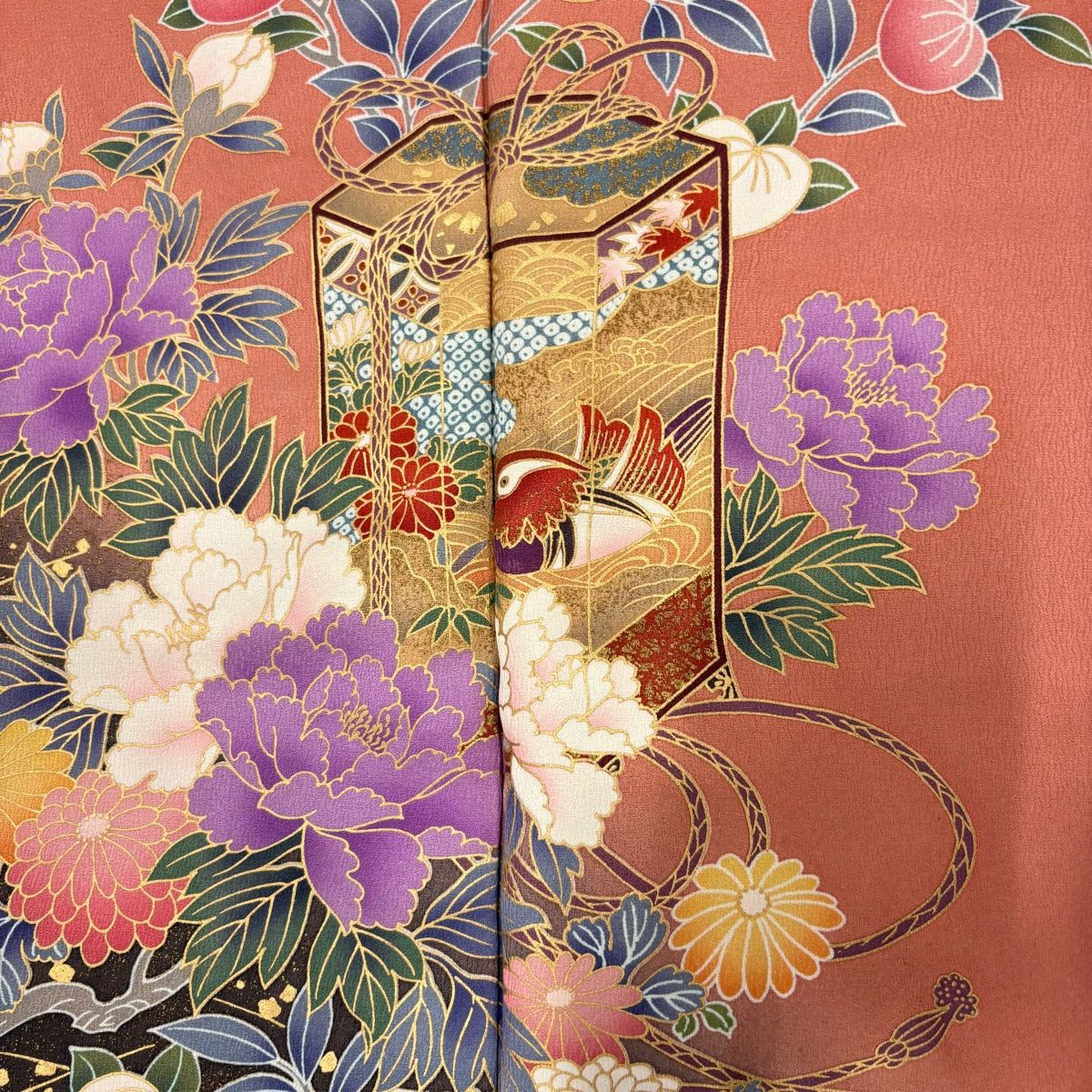 振袖 身丈165cm 裄丈68cm L 袷 貝桶 琴 金彩 ぼかし サーモンピンク 正絹 秀品の検索結果