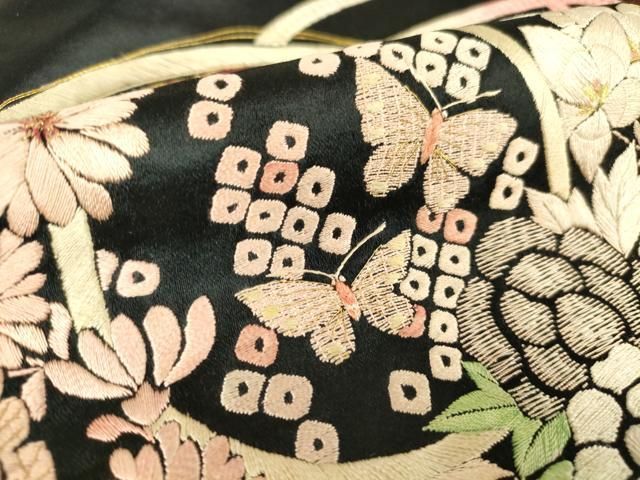 平和屋着物 アンティーク 大正ロマン 九寸名古屋帯 駒刺繍 総刺繍 鏡裏花文 黒地 金糸 正絹 DAAX3376az GLOBALQUALITYIMPORTS_COM