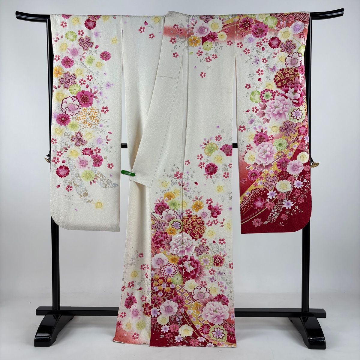 振袖 身丈169.5cm 裄丈68.5cm L 袷 牡丹 桜 銀通し 箔 クリーム 正絹