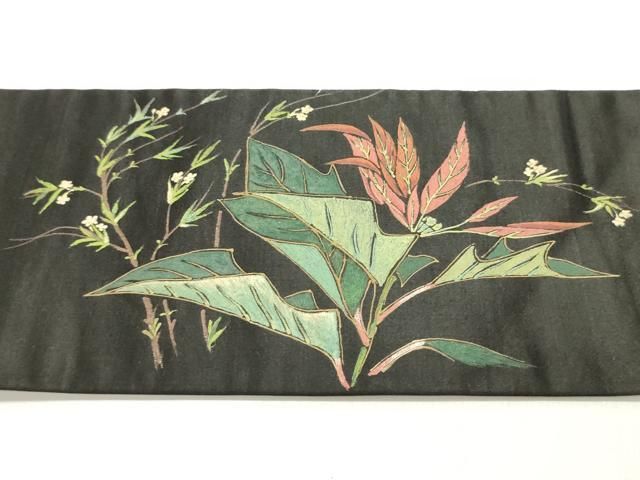 平和屋着物 アンティーク 大正ロマン 九寸名古屋帯 手描き 草花文 黒地 正絹 DAAY0171obの検索結果