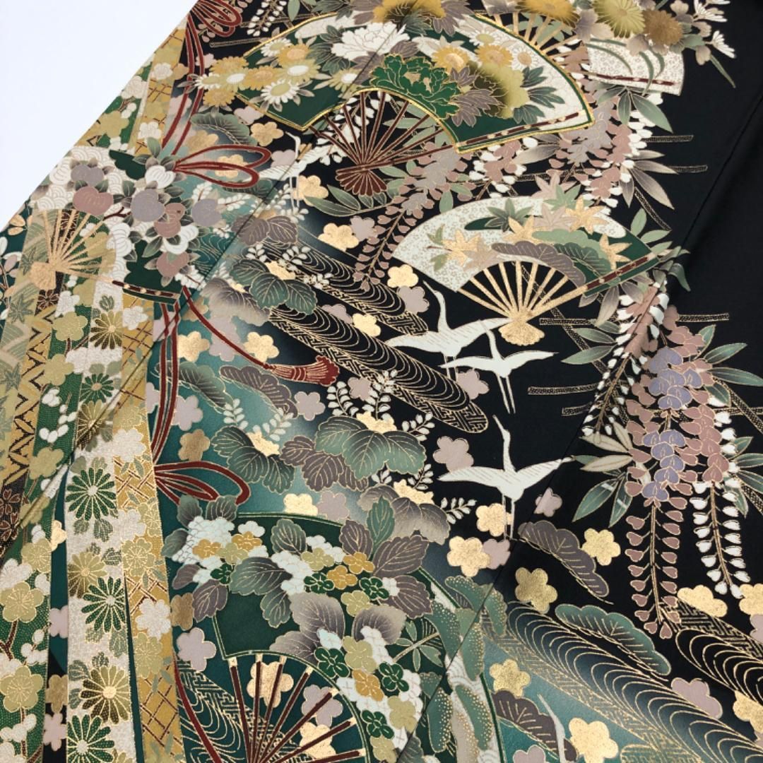黒留袖 扇子に花模様 飛翔鶴 青海波 組紐 金駒刺繍 K-5332の検索結果