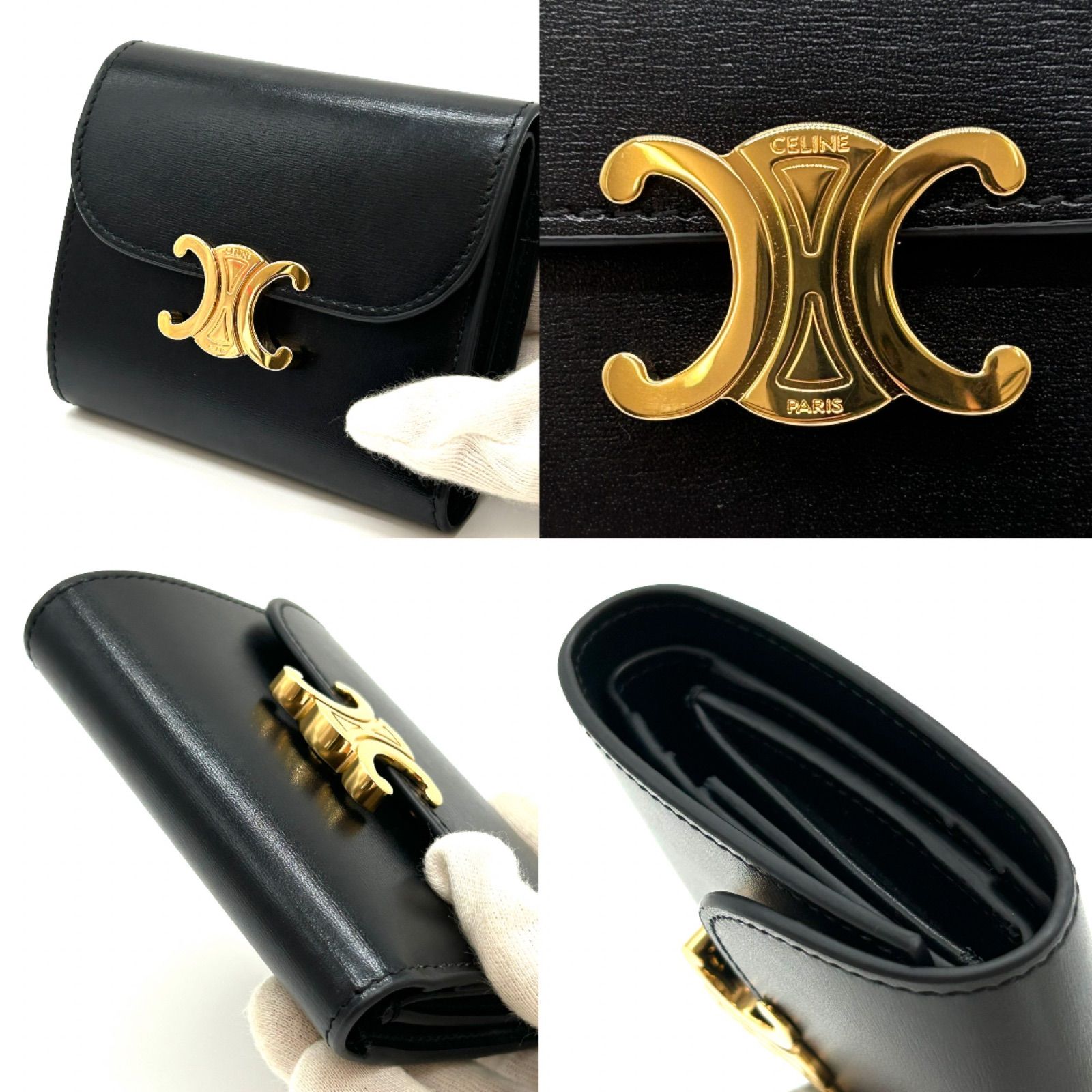 CELINE セリーヌ トリオンフ フラップウォレット レザー 三つ折り財布 ブラック ゴールド金具 レディース コンパクトウォレット 財布 ミニ財布 スモール GLOBALQUALITYIMPORTS_COM