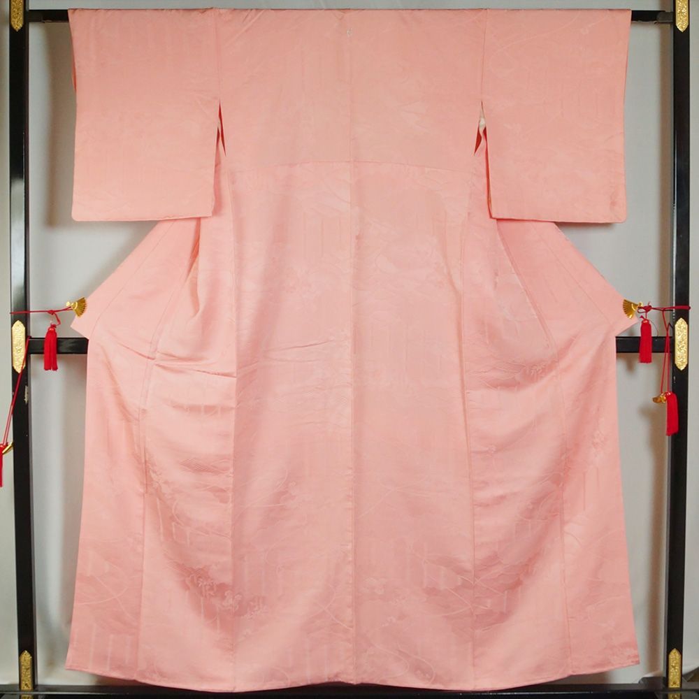 色と地紋: 優しい鴇色系(ピンクがかった薄紅色)に染め上げられ、雲取に春秋草花、波頭などの地紋が施された優美な一枚です。
