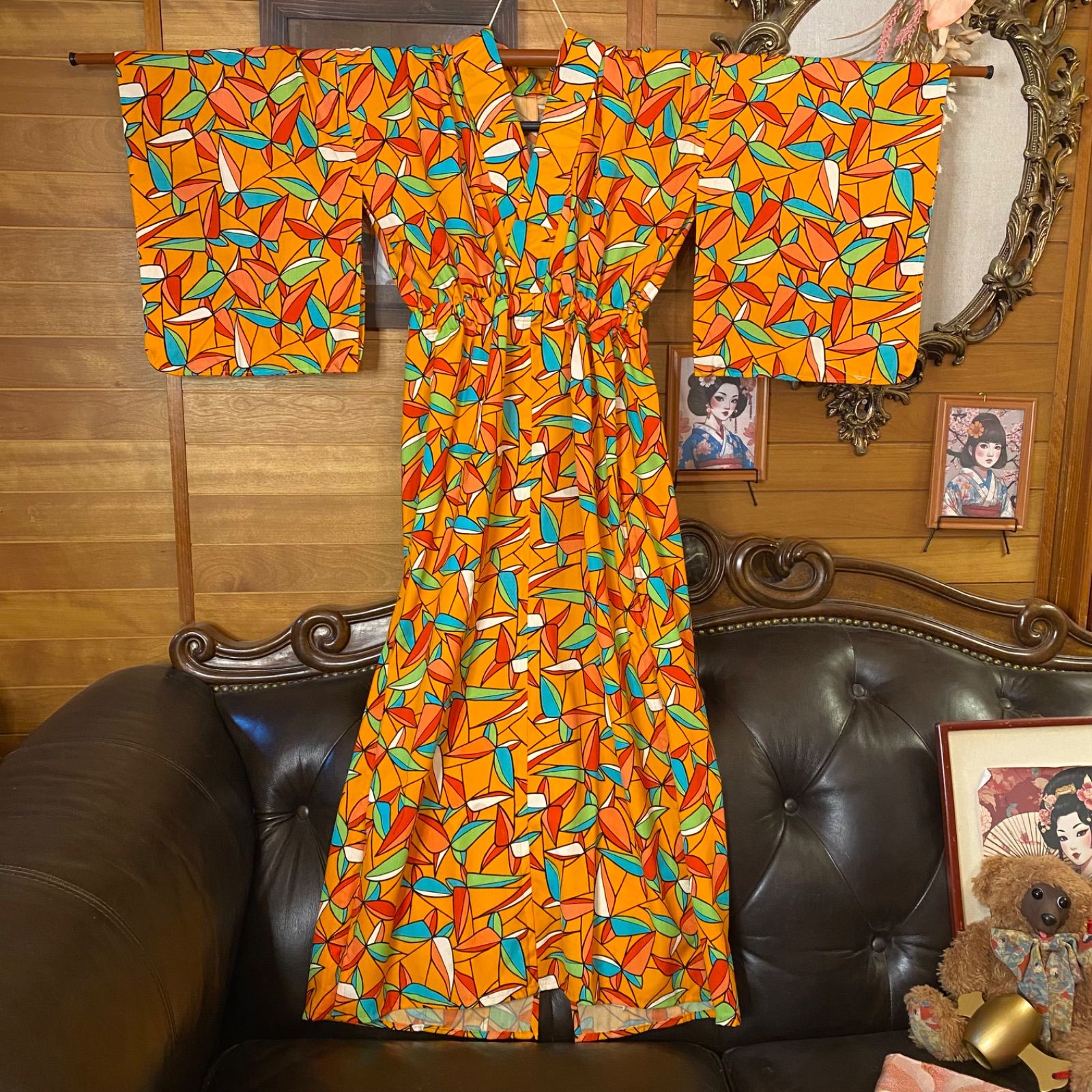 和洋折衷ロングワンピース 着物アンサンブル 名古屋帯サッシュベルト付き ハンドメイド レトロ 古着 オレンジ×幾何学 aKW-105 GLOBALQUALITYIMPORTS_COM