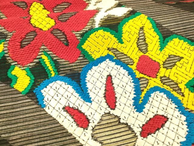 平和屋着物 夏物 アンティーク 大正ロマン 六通柄袋帯 唐織 花唐草文 黒地 金糸 正絹 DAAX5931cmの検索結果
