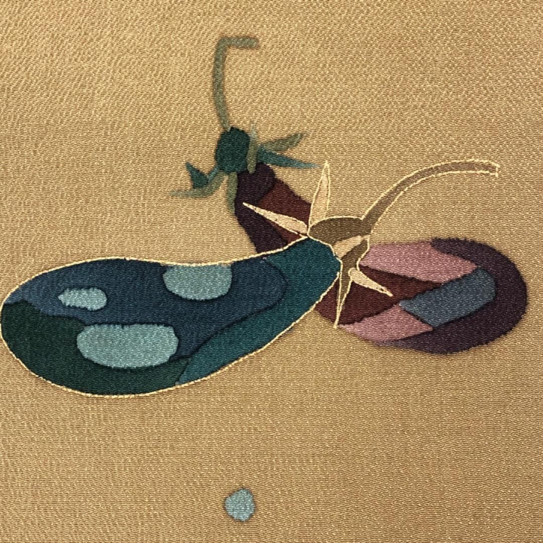 名古屋帯 野菜柄 茄子 豆 縮緬 国防色 長尺 O-5543 GLOBALQUALITYIMPORTS_COM