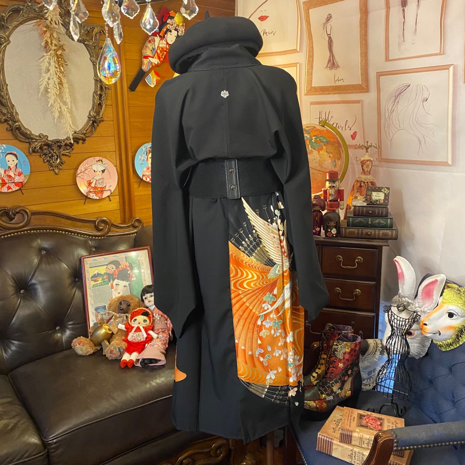 和洋折衷 黒留袖 着物 リメイク ワンピース ドレス 洗える 化繊 ハンドメイド レトロ 古着 和 モダン 舞う鳥×金×黒 ブラック TKW-45の検索結果