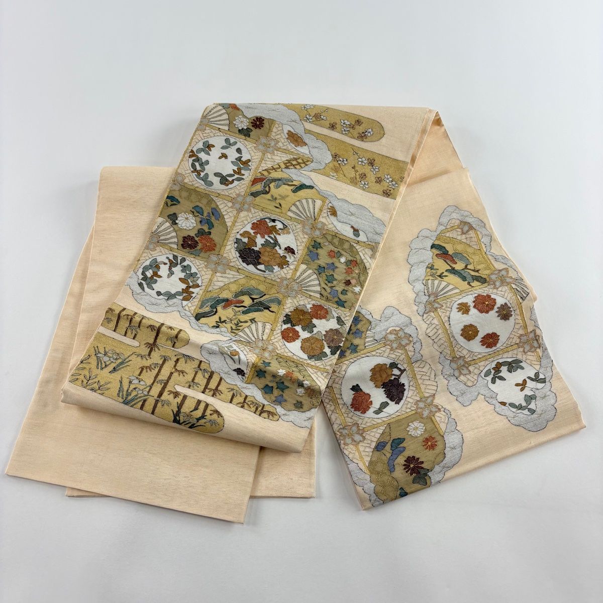 袋帯 丸文 扇 金銀糸 ベージュ お太鼓柄 正絹 GLOBALQUALITYIMPORTS_COM