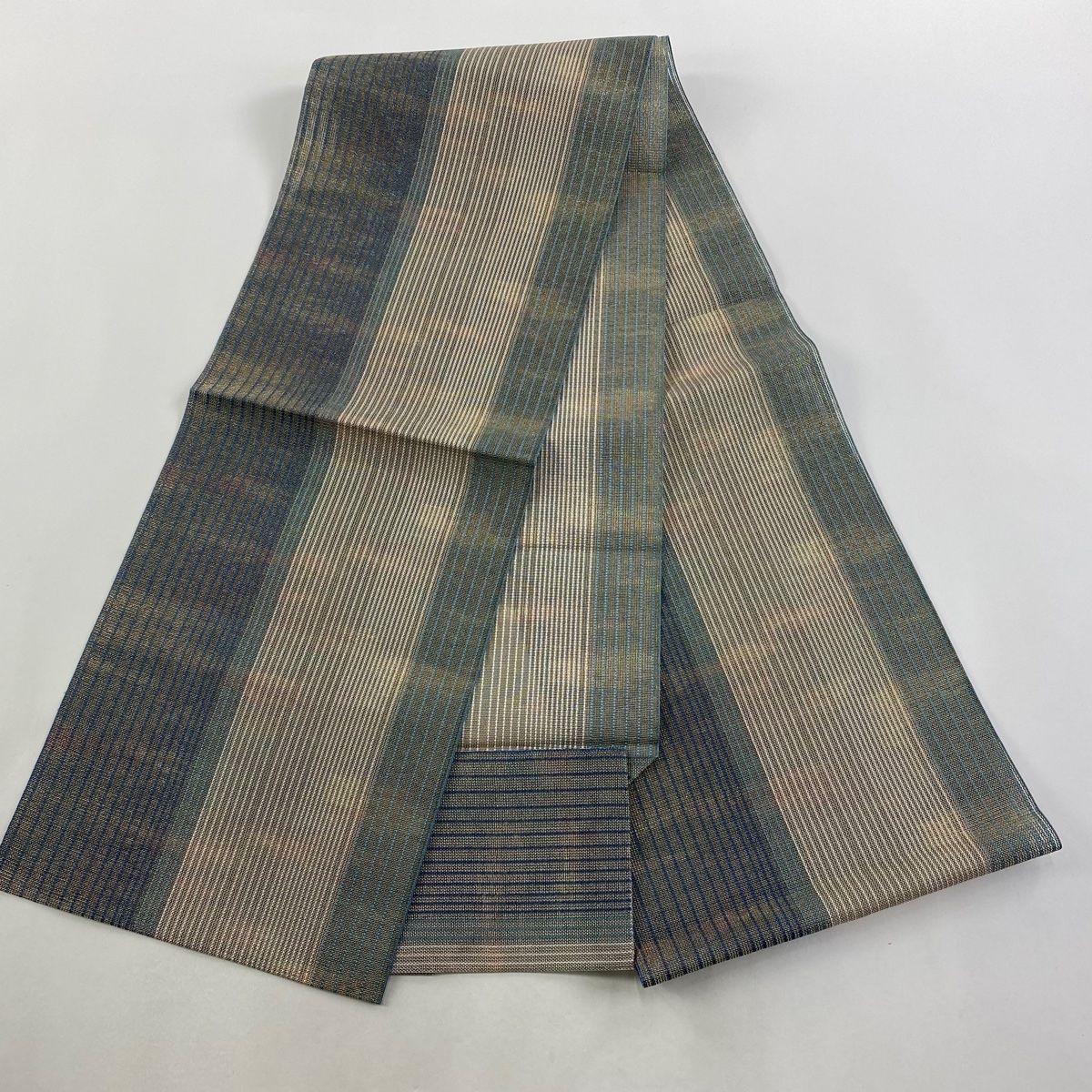 名古屋帯 秀品 八寸名古屋帯 松葉仕立て 縞 金糸 灰緑 正絹 GLOBALQUALITYIMPORTS_COM