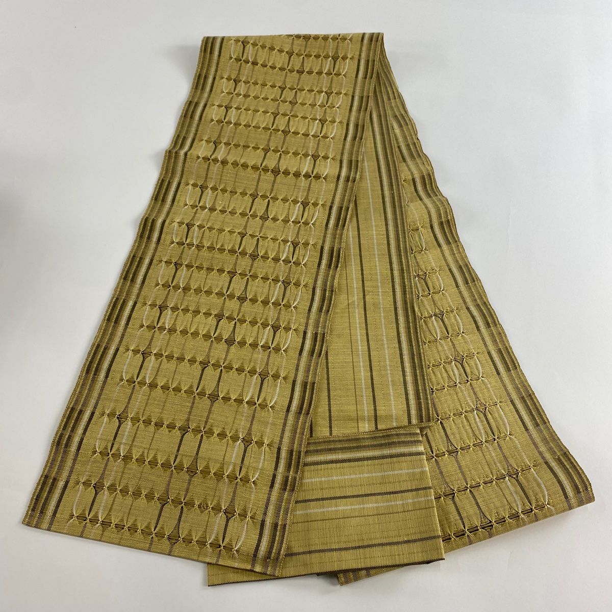 名古屋帯 秀品 八寸名古屋帯 松葉仕立て 幾何学模様 金糸 薄黄土色 正絹の検索結果