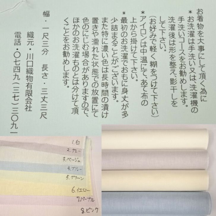 長襦袢 生地 反物 スポエリー アイスコットン 近江の麻織物 白色 ホワイト 灰色 グレー 生成り ベージュ 青色 ブルー 品 綿麻生地 色合わせしやすい 無地 緯糸アイスコットン100% 快適 夏 単衣 近江 麻 織物 通年 仕事着 仕立て GLOBALQUALITYIMPORTS_COM