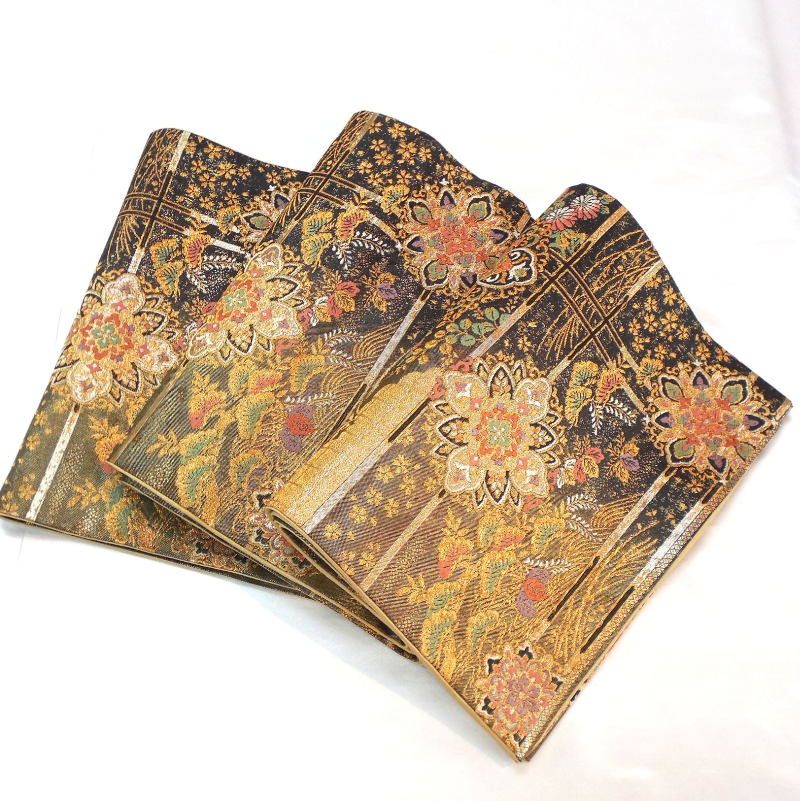 帯は黒地に金糸入り宝相華がデザインされ、