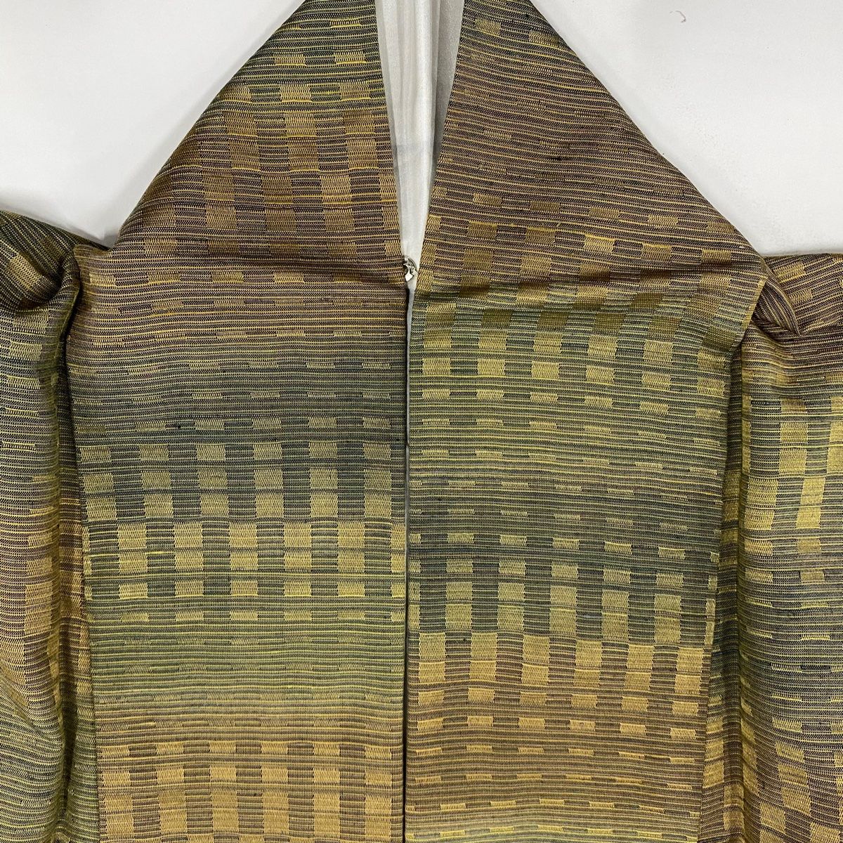 小紋 身丈154.5cm 裄丈64.5cm M 袷 縞 幾何学模様 茶緑色 正絹 GLOBALQUALITYIMPORTS_COM