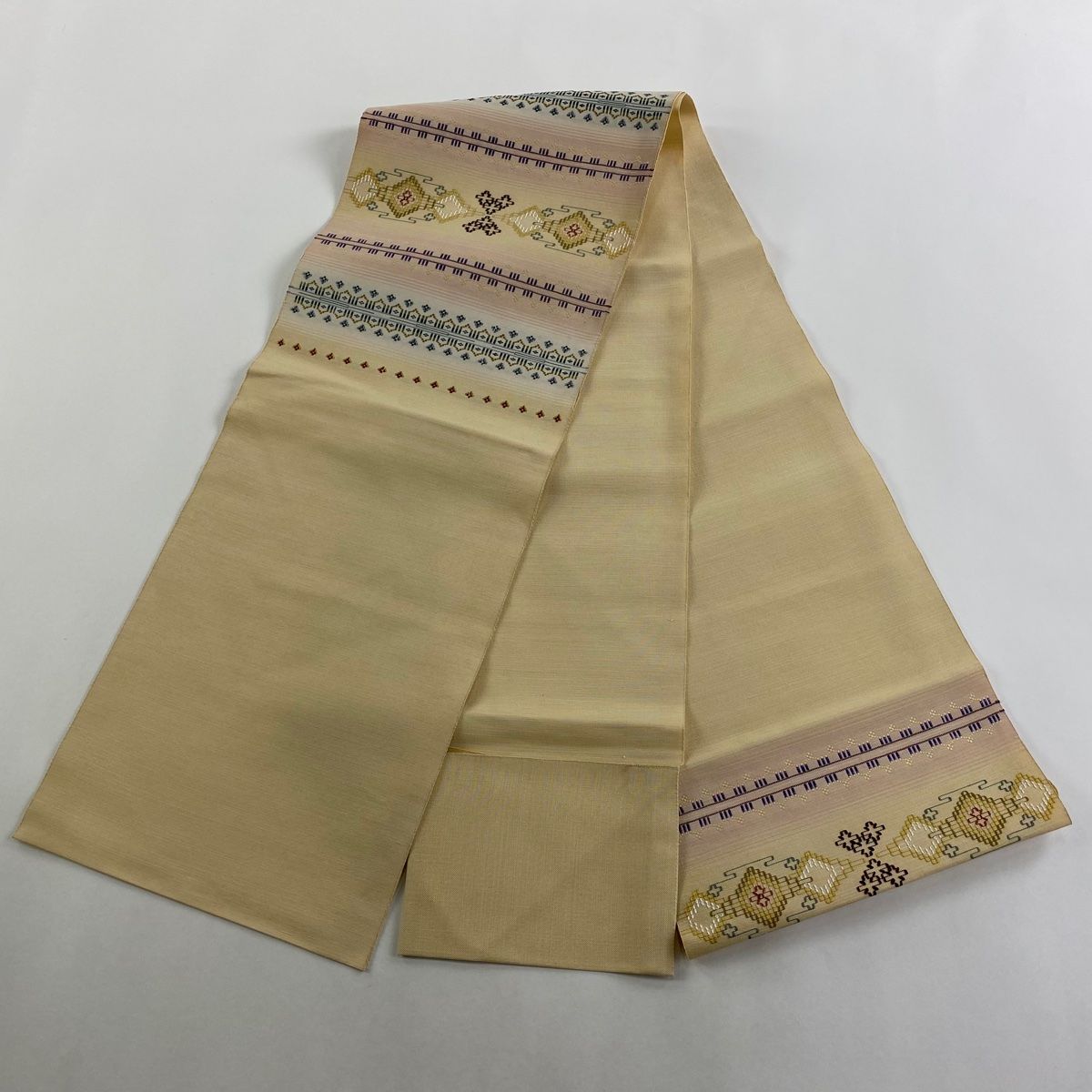 名古屋帯 八寸名古屋帯 松葉仕立て 幾何学模様 刺繍 ベージュ 正絹 GLOBALQUALITYIMPORTS_COM