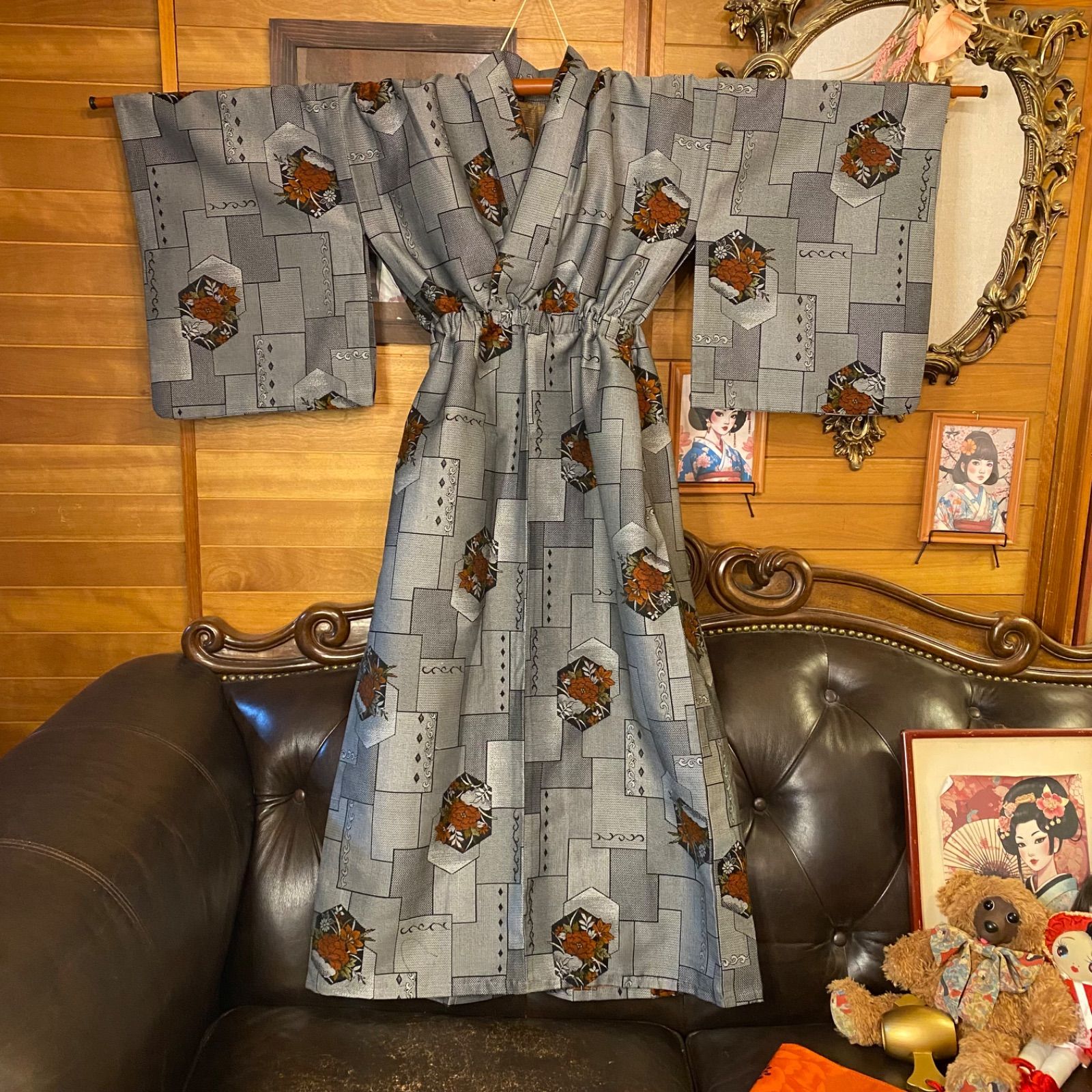 着物リメイクロングワンピース アンサンブル 帯サッシュベルト付き 和洋折衷 ハンドメイド レトロ 古着 煙鼠グレーの幾何取り×六角花文 aKW-89の検索結果