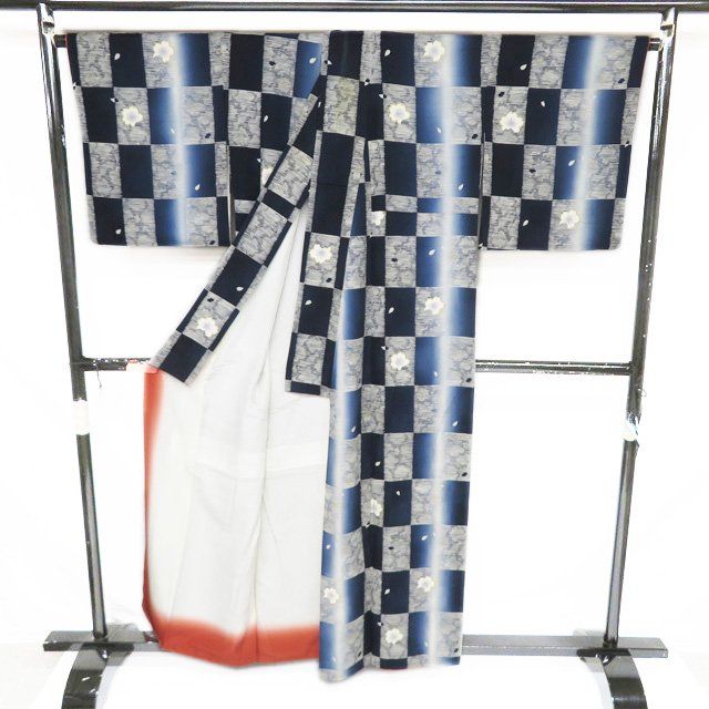 小紋 着物 正絹 袷 カジュアル 長格子模様 桜模様 濃紺色 多色 金 身丈159.5cm 裄70cm M きもの北條 A1282-14 GLOBALQUALITYIMPORTS_COM