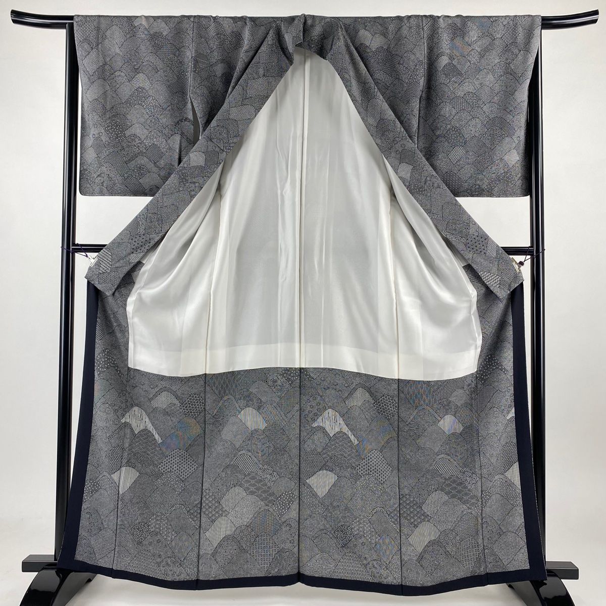 江戸小紋 身丈163.5cm 裄丈64.5cm M 袷 人間国宝 六谷梅軒 落款 山並み 寄せ柄 黒灰 正絹の検索結果