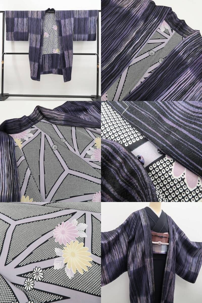 艶を放つ青紫色の地を濃淡状に浮かび上がる格子の陰影、不統一な縦縞ラインが誘う不思議な視覚のインパクト、従来ある縞のパターンに彩り格子を重ねるなど細部にまで拘りが感じられるひと品、そして裏地の絵柄が導く創作着物の粋な奥行、それは魅惑の温もりに醸し出されるお洒落モダンな和の香り、正絹のしっとりとした艶が和の潤いを一段と美しく際立たせています。