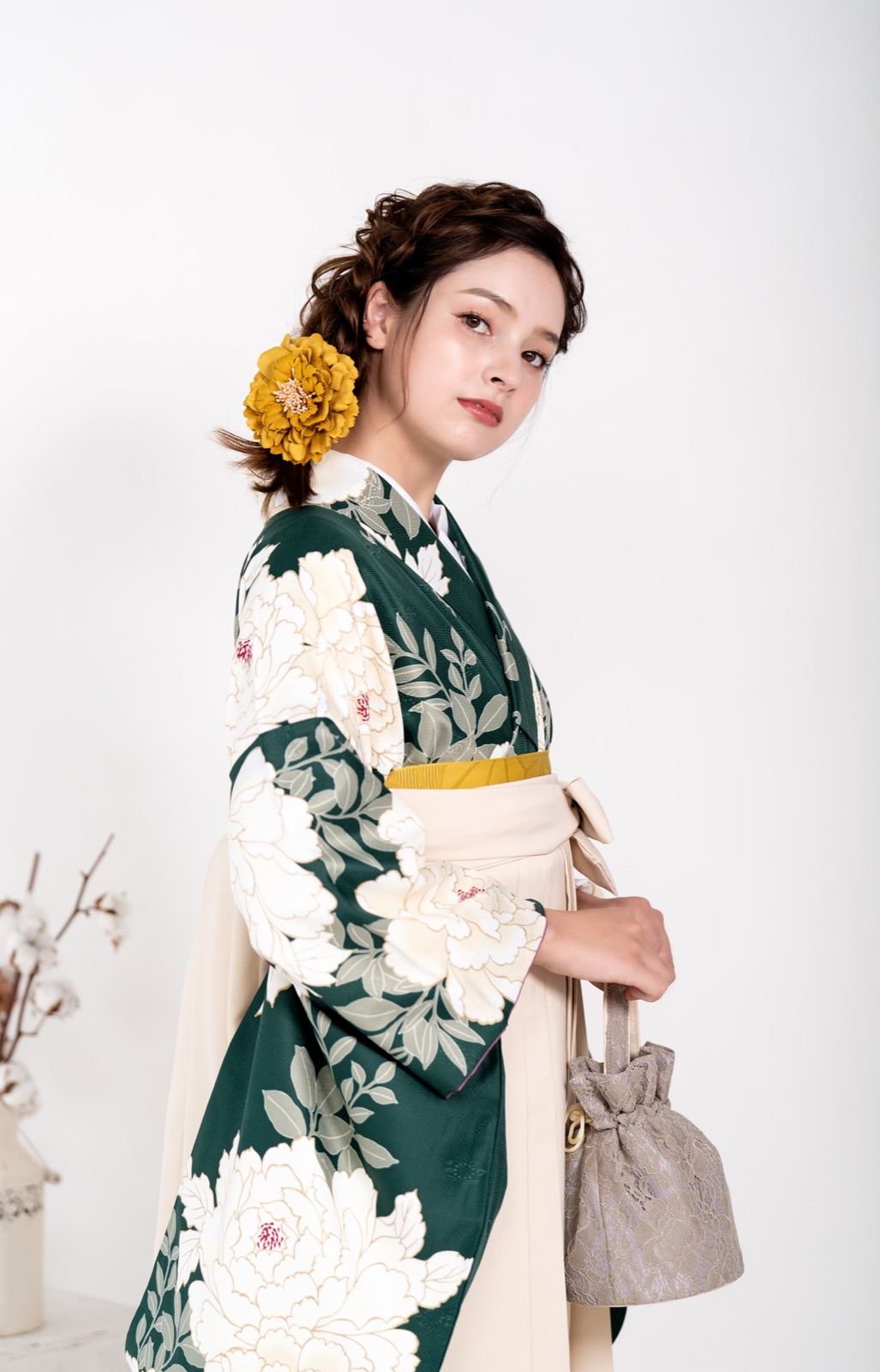 • 卒業式袴3点セット 深緑にアイボリーの牡丹