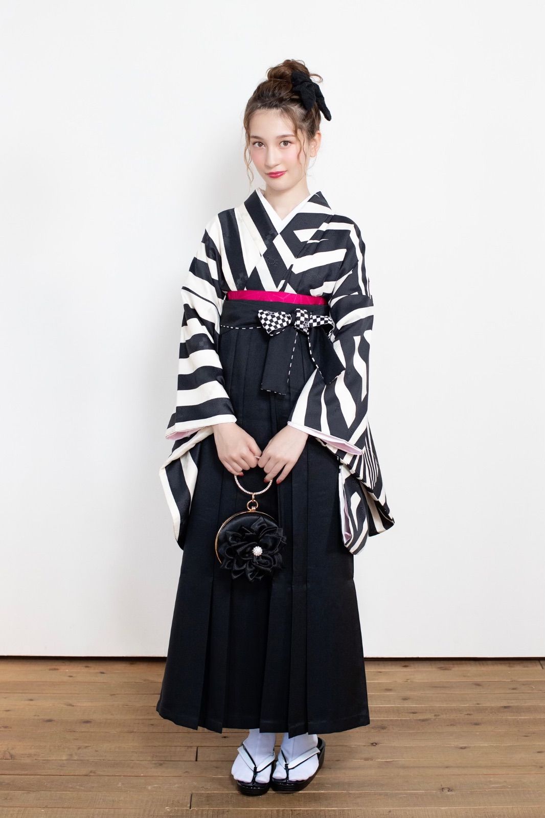 着物ジェンヌ 卒業式袴3点セット 幾何学模様とストライプ 二尺袖 袴 白黒×黒の検索結果