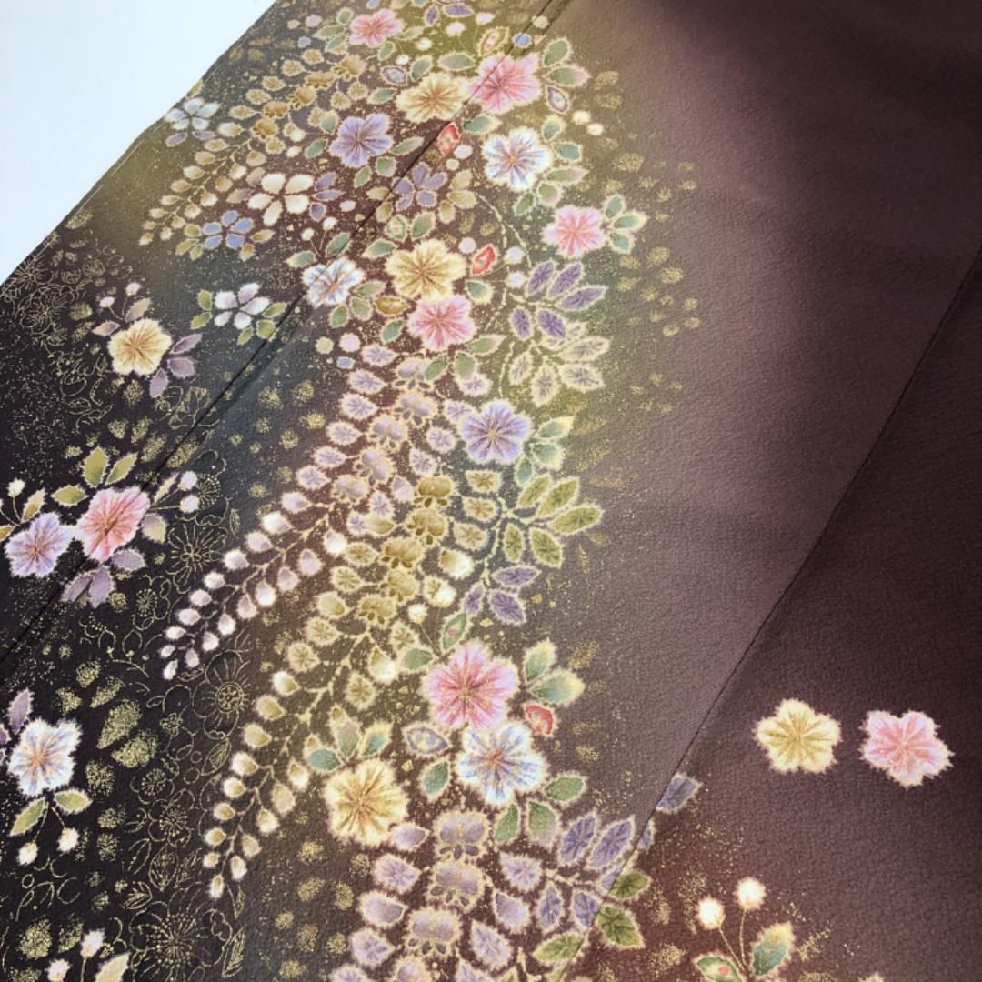 溜色のお色味に美しい辻が花絞りがデザインされた雰囲気の良い素敵なお品でございます。