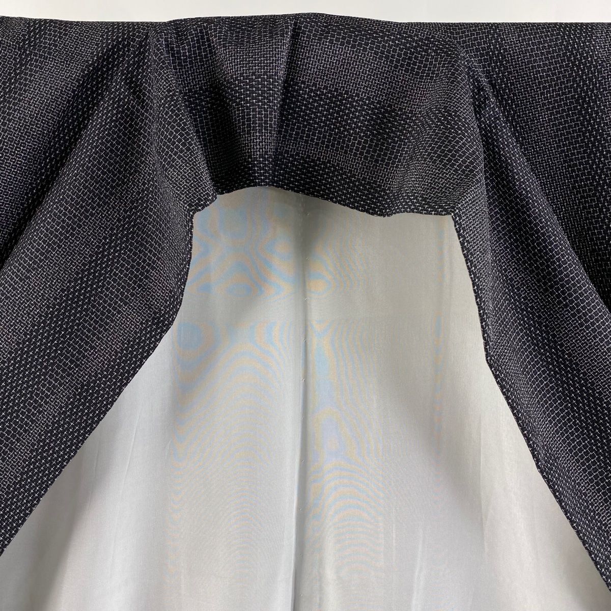 お召 身丈161.5cm 裄丈65cm M 袷 雪の中のきれ やまだ織 本塩沢 証紙 よろけ縞 亀甲絣 黒灰 正絹 WWW_GLOBALQUALITYIMPORTS_COM