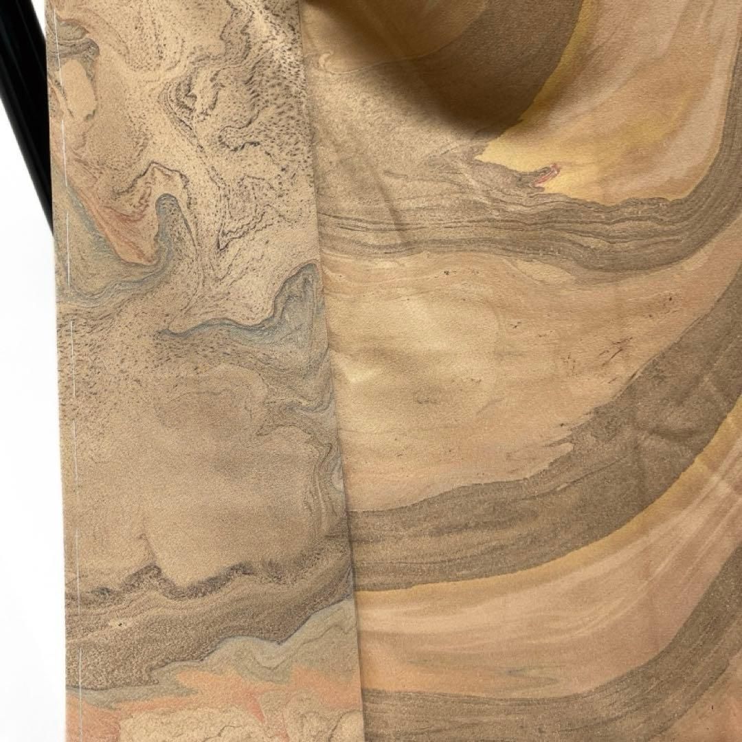 くすみのあるベージュの地に墨流しによるマーブルの文様がお洒落なデザインの一着です。