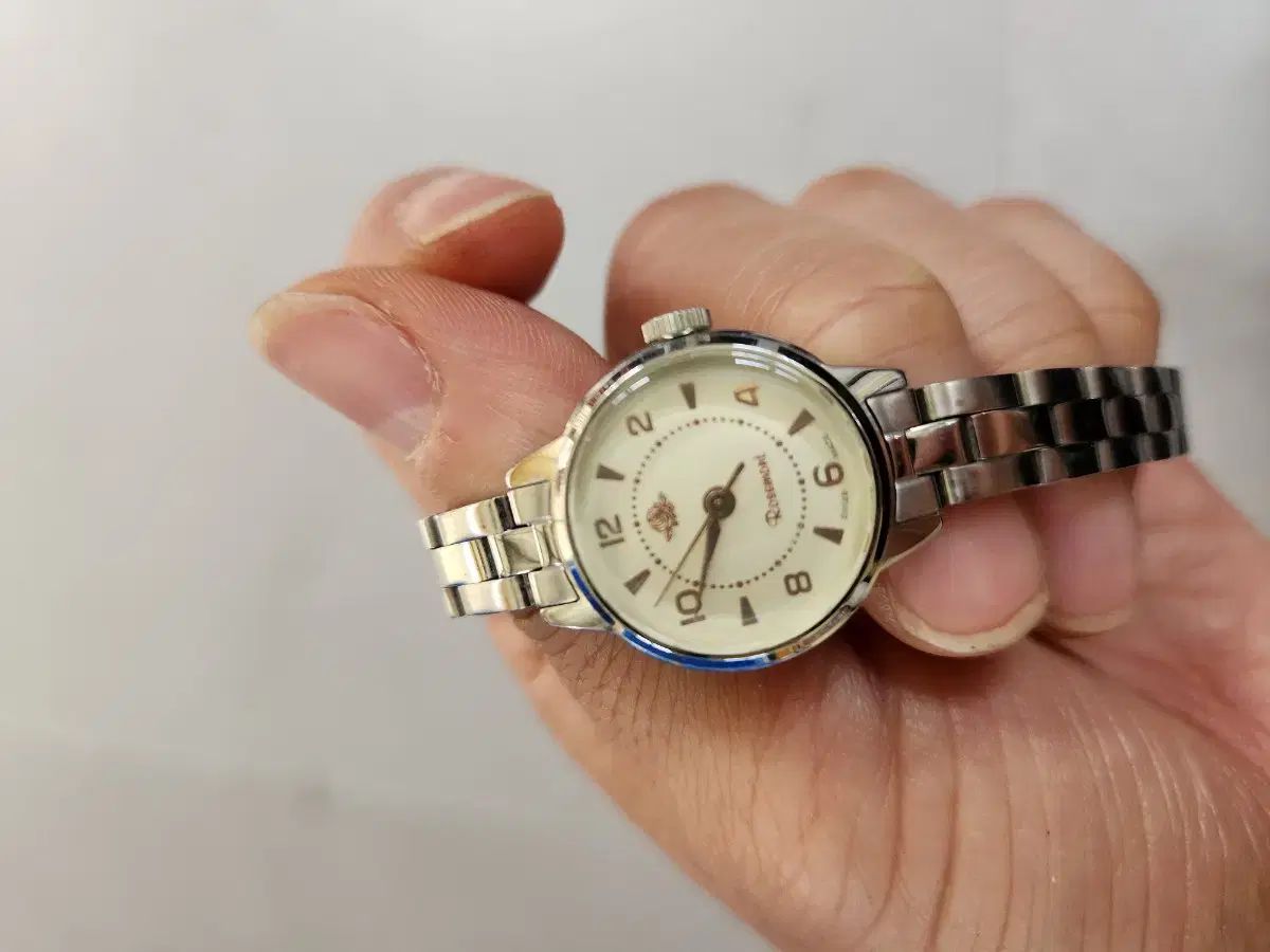 直径は 3cm 程度 の 華奢 小さな 時計 です。リストも 華奢 に 見えます。