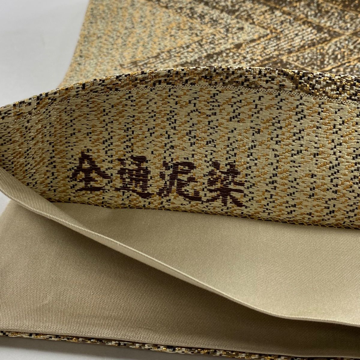 袋帯 秀品 落款 伝統工芸士 寺田寛志 全通泥染 幾何学 菱 金糸 灰茶 全通 正絹の検索結果