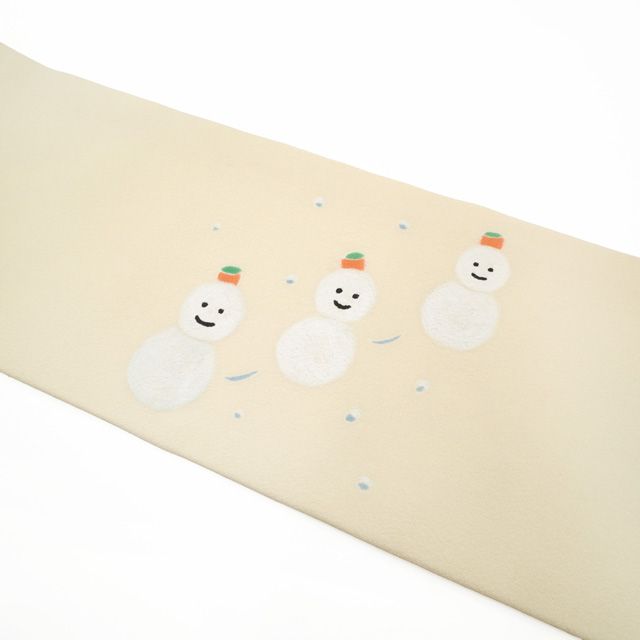 新古品 名古屋帯 九寸 正絹 薄卵色地 淡オレンジベージュ かわいい 雪だるま ゆきだるま 手染め 手描き 柄 デザイン お太鼓柄 カジュアル 冬 仕立て上がり みやがわ sb54599 WWW_GLOBALQUALITYIMPORTS_COM