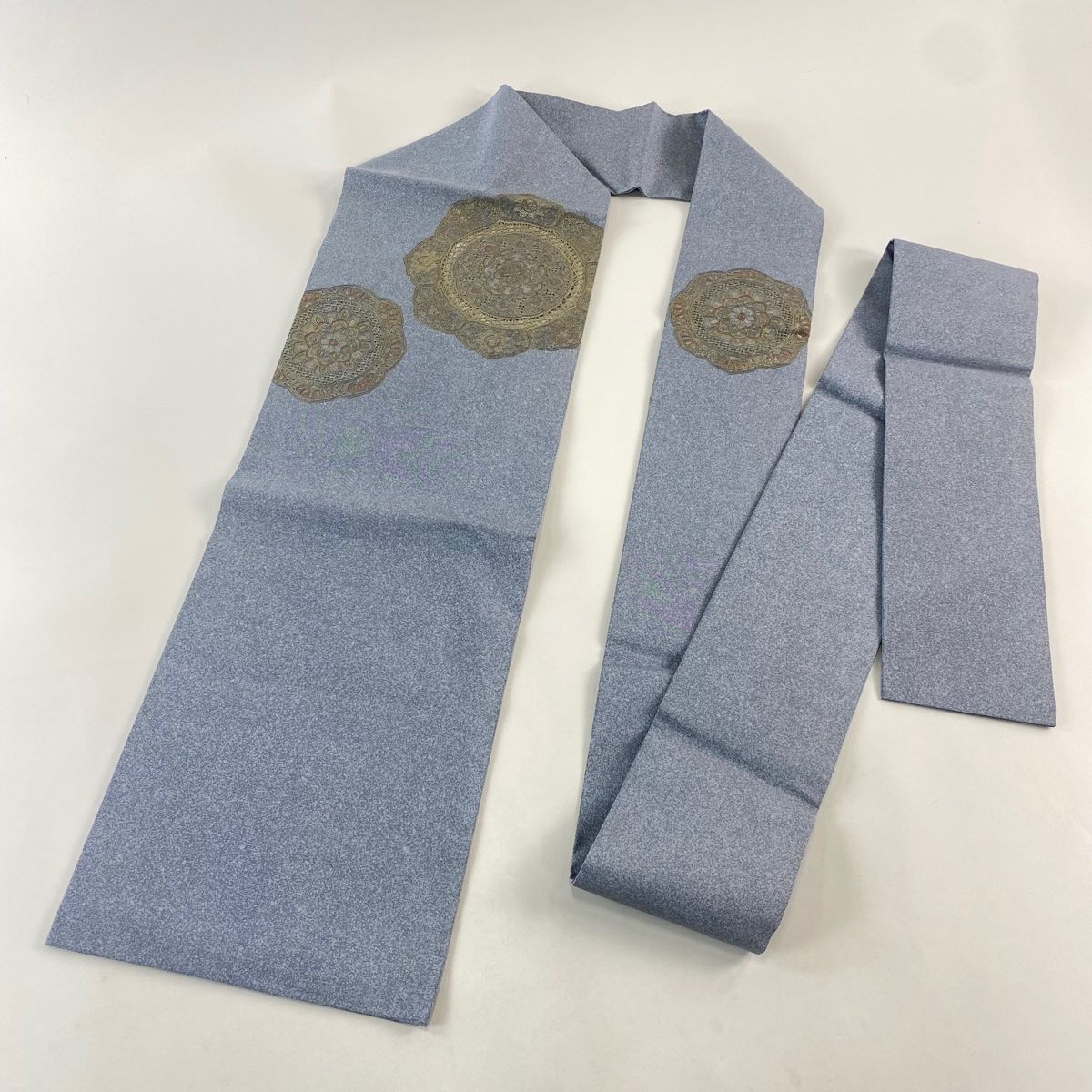名古屋帯 秀品 華文 絵皿模様 刺繍 金彩 青灰色 正絹 WWW_GLOBALQUALITYIMPORTS_COM