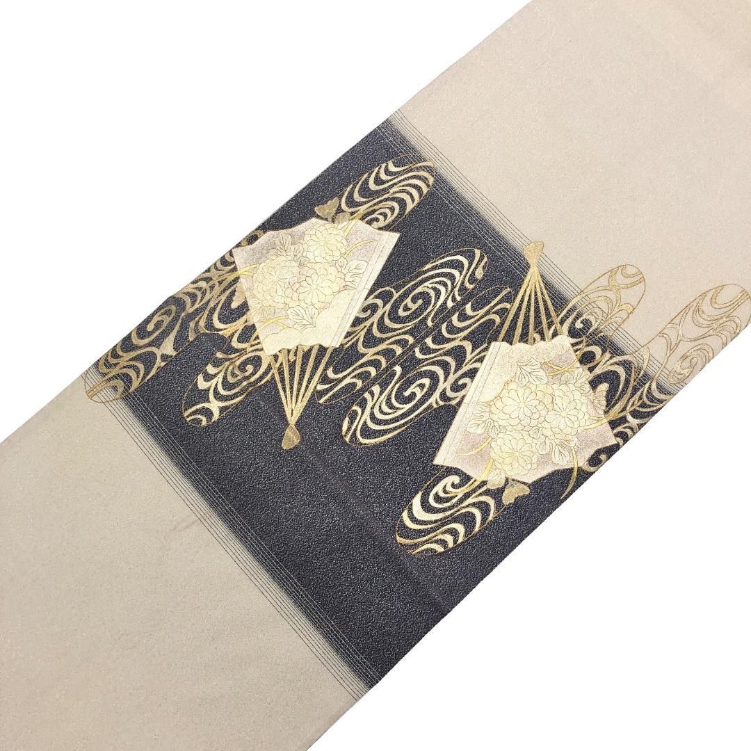 袋帯 綴れ織 扇子に花模様 流水 金彩 乳白色 O-5655の検索結果
