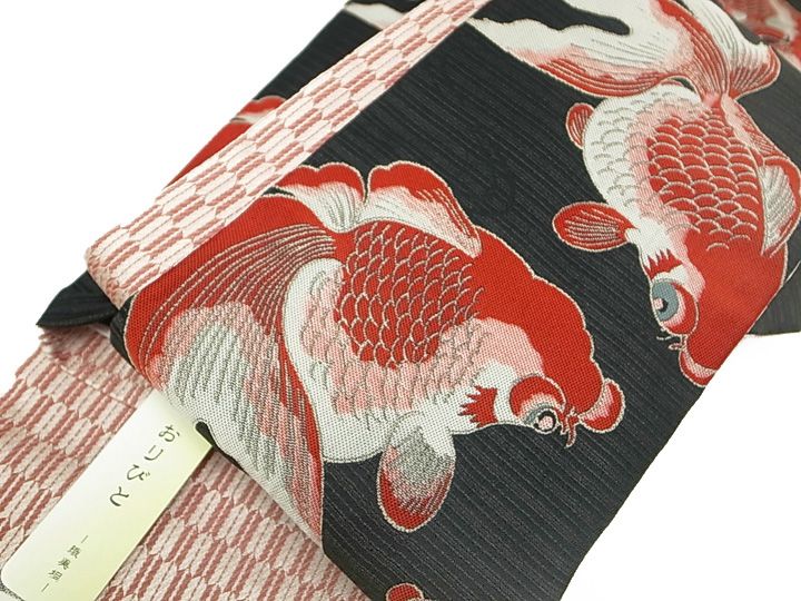 半幅帯 おりびと 金魚 リバーシブル カジュアル 浴衣にも きんぎょ 矢羽根 黒 臙脂色 白 I-1A e690 KSi WWW_GLOBALQUALITYIMPORTS_COM